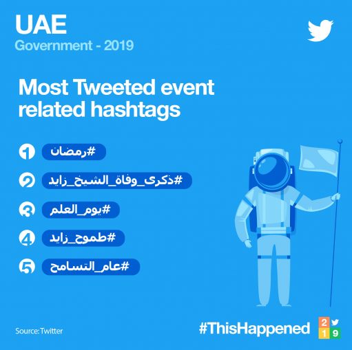 According to the report, the most prominent event hashtags in the UAE in 2019 included a special hashtag for the Holy Month of Ramadan; the anniversary of Sheikh Zayed’s passing; UAE Flag Day; Zayed’s ambition with regard to the UAE space mission; and the Year of Tolerance.
