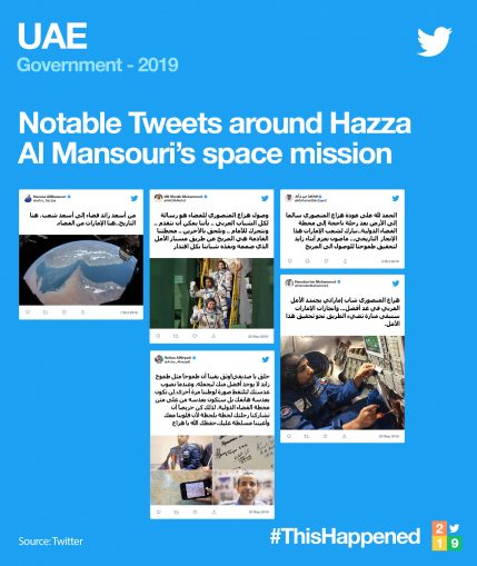 The first UAE Astronaut Hazza Al Mansoori’s historic space mission to the International Space Station, ISS, topped the list of UAE events that attracted the most engagement from global and local Twitter users.